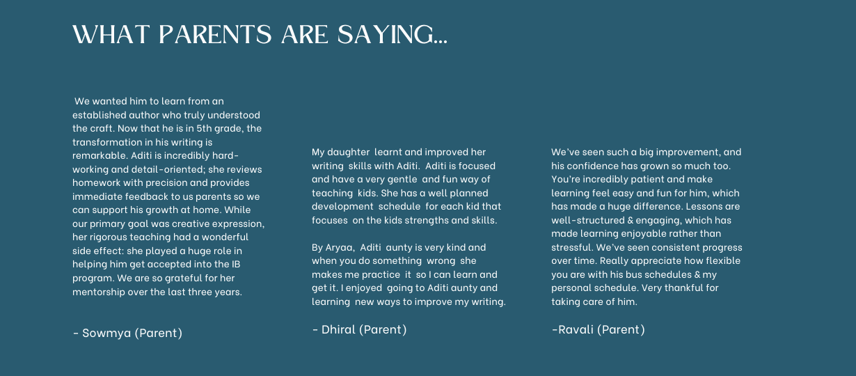 In 2022, after briefly attempting a traditional 9–5 role that her health—particularly chronic migraines—would not allow her to sustain, Aditi leaned fully into what people had been asking her to do for years: teach. She began tutoring children in creative writing and ELA, helping them build strong foundations in language, structure, and storytelling. Since then, she has coached hundreds of students, nurturing not just academic skills, but creative courage.